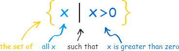 The notation articulates, “The set of all x’s, such that x is greater than 0“.