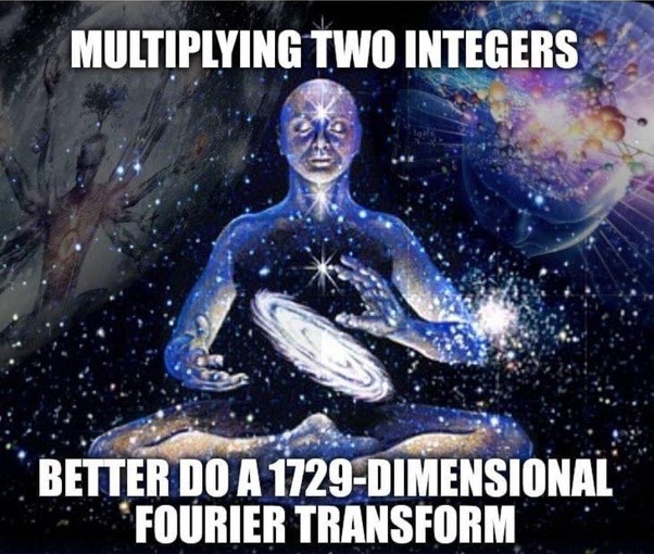 Maybe we should also teach galactic algorithms. 😁 A galactic algorithm is the fastest known way to multiply two numbers, which is based on a 1729-dimensional Fourier transform. [6]