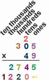 “The standard algorithm (vertical algorithm) is generally a faster method but, unlike the area or grid methods, it does not promote understanding or encourage the development of mathematical thinking. Students rarely understand why they are carrying numbers or what that “placeholder zero” is all about in the second row of calculations. It is best to introduce children to long multiplication with the area method/grid method before using the standard algorithm. The area method also supports the important ability to estimate answers.” [4]
