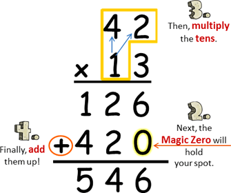 I had one teacher instruct the students to use the Magic Zero when multiplying. Magic Zero!? There is nothing magic about it. Until the teacher brought it up in class, I finally realized that when multiplying by the tens place we need to have a zero because we are multiplying by a two-digit number. This confusion and use of the Magic Zero can be eliminated if we just teach the properties of real numbers, especially the distributive property!
