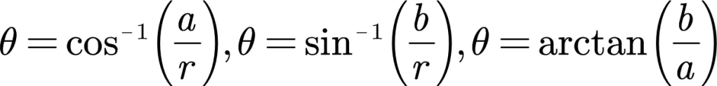 For all complex numbers z = a + bi with norm r = √(a2 + b2), you can find the argument 𝜃 using one of the following formulas: