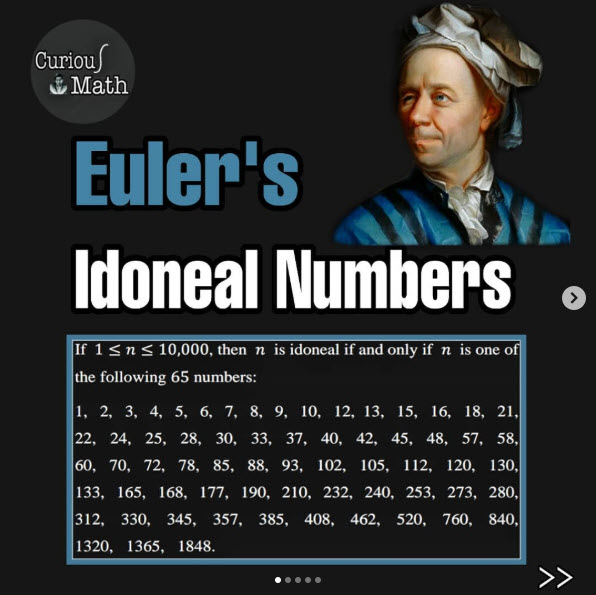 “Euler’s Idoneal Numbers (Also Called Suitable Numbers or Convenient Numbers).” 2025. Instagram. curious_math. Accessed August 11. https://www.instagram.com/p/CNxFxHUjbqn/?utm_source=ig_web_copy_link.