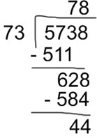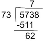 511 is smaller than the dividend; therefore 7 “does fit”. We write 511 beneath the digits of the dividend and then divide and subtract. - Drop the next digit of the dividend, which is 8. Now, you have to divide 628 by 73.