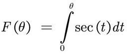 In 1599 the English mathematician Edward Wright explained the mathematics of exactly how Mercator’s projection should be done. Let’s say that the distance on Mercator’s map from the equator to the parallel at latitude θ is F(θ), in units where the equator has length 2π on the map. After some calculations, taking the equator as height 0, so F(0) = 0, we can write it as a definite integral: