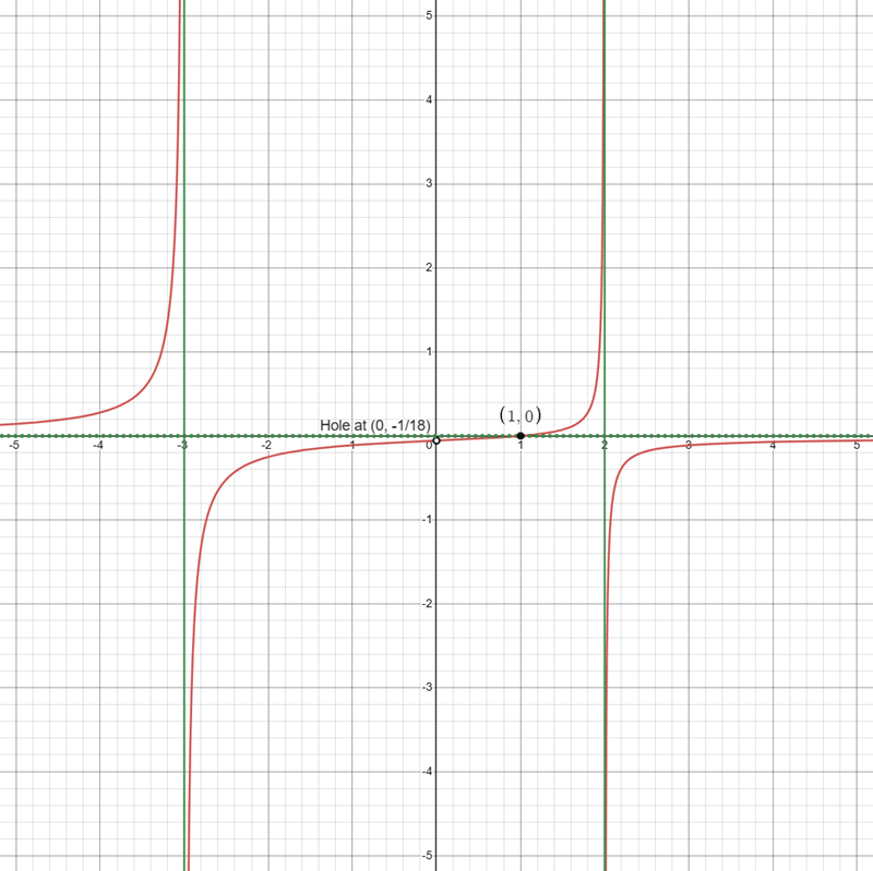 Our x-intercept is now (1, 0) No y-intercepts since we have a hole at (0, -1/18)